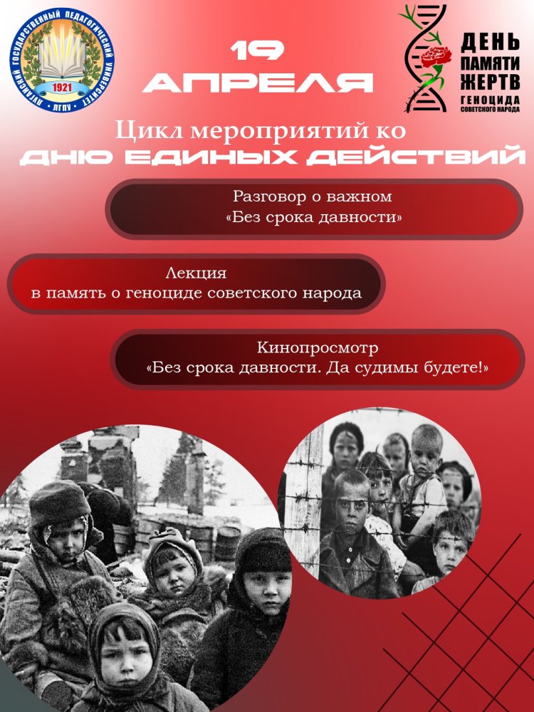 16 апреля в ЛГПУ стартует цикл мероприятий, приуроченный ко Дню единых действий в память о геноциде советского народа нацистами и их пособниками в годы Великой Отечественной войны.