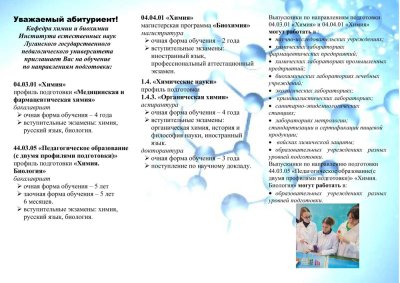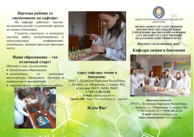 Кафедра химии и биохимии существует с момента создания нашего учебного заведения и осуществляет подготовку по направлениям: «химия», педагогическое образования «химия/биология».