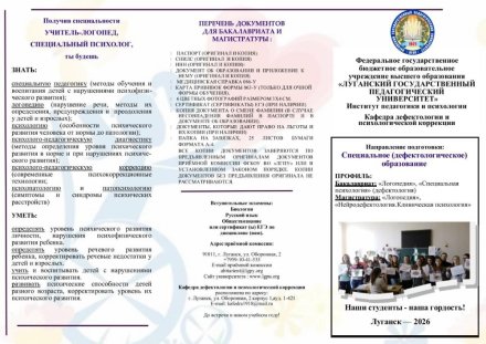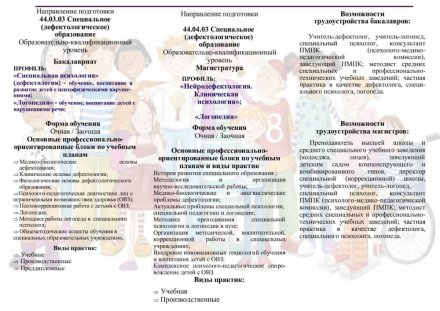 На кафедре дефектологии и психологической коррекции по направлению подготовки 44.03.03 «Специальное (дефектологическое) образование» студенты обучаются по профилям бакалавриата «Логопедия», «Специальная психология», а также по направлению подготовки магистратуры 44.04.03 «Специальное (дефектологическое) образование», магистерские программы «Логопедия», «Специальная психология».