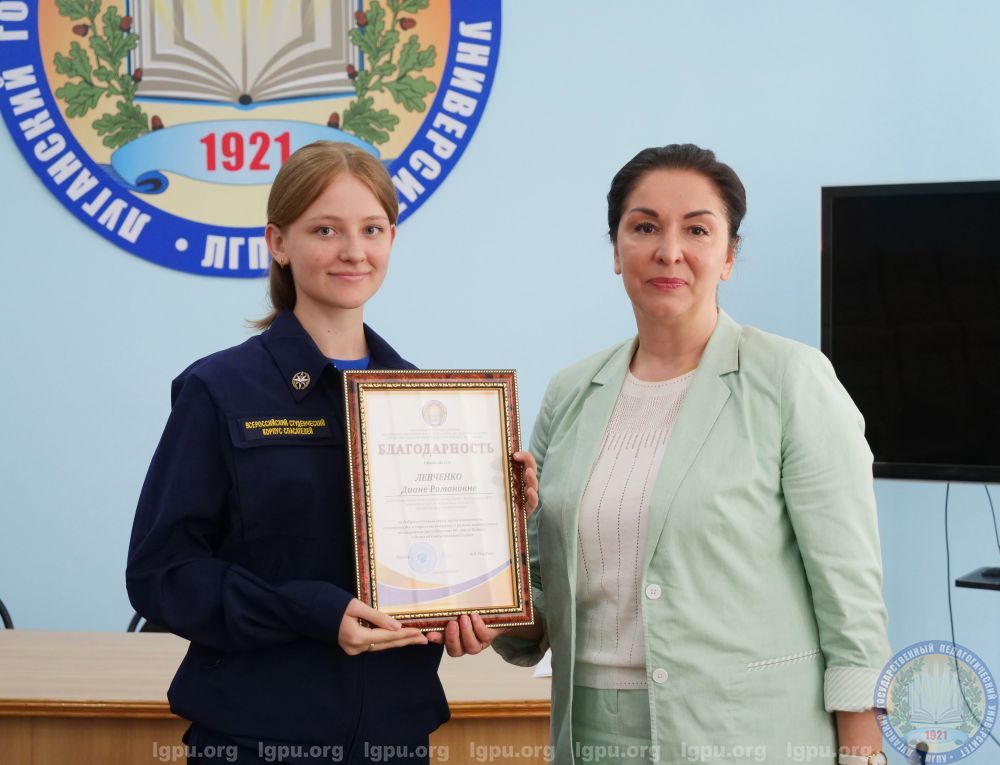 В Луганском государственном педагогическом университете 29 мая вручили благодарности студентам-добровольцам студенческого спасательного отряда «Ворошиловец» ЛГПУ.К активистам обратилась ректор ЛГПУ, депутат Народного Совета ЛНР Жанна Марфина: