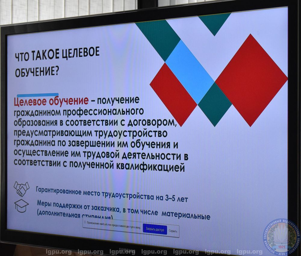 Целью встречи стало информирование абитуриентов и иных граждан, планирующих поступать на целевое обучение в ЛГПУ, об опубликованных на ЕЦП «Работа в России» предложениях целевого обучения, о сроках и механизме подачи заявок.