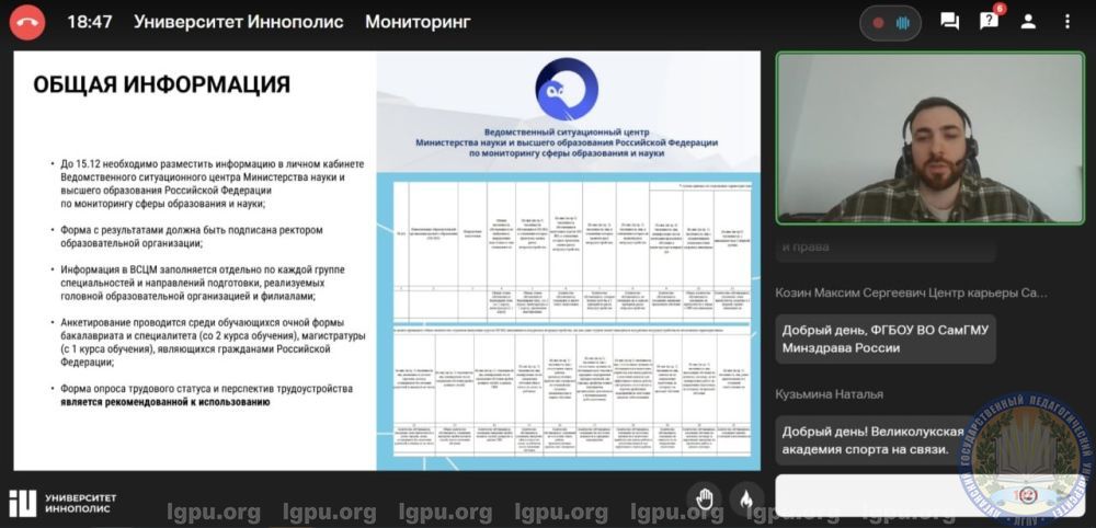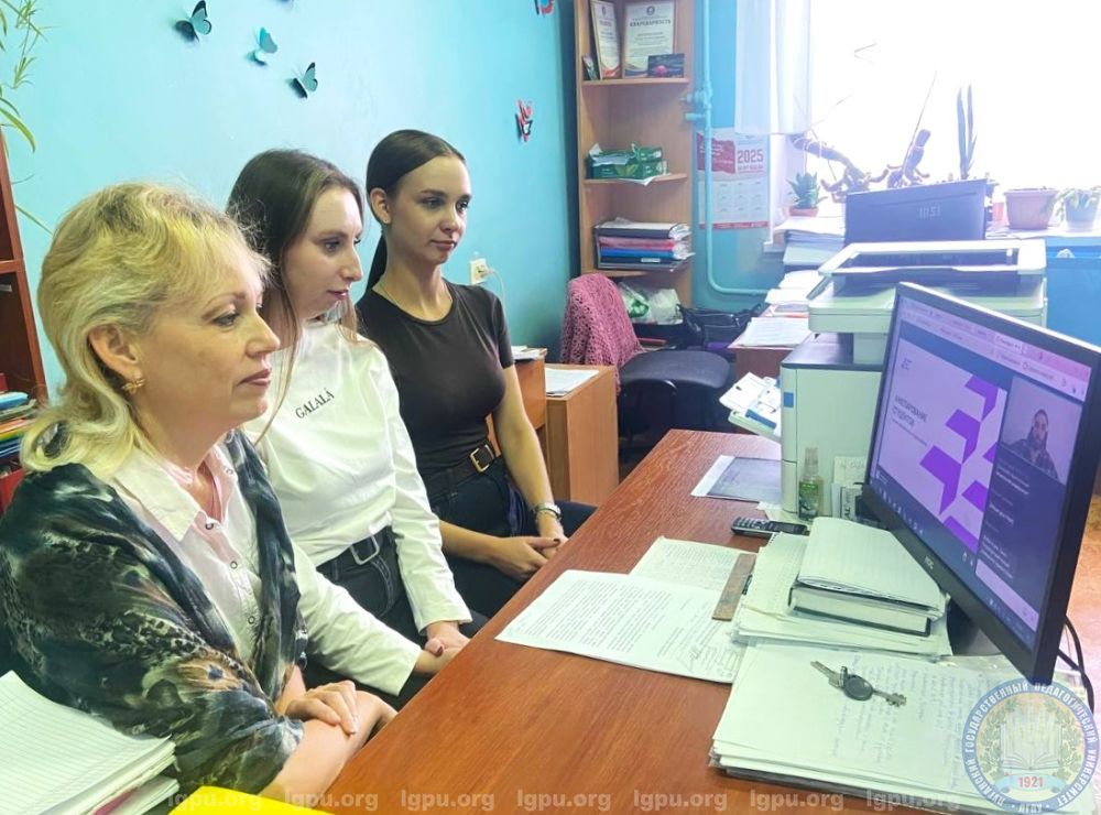 Представители Луганского государственного педагогического университета 17 ноября приняли участие в вебинаре, посвященном вопросам, связанным с порядком проведения мониторинга оценки трудового статуса и перспектив трудоустройства обучающихся и будущих выпускников вуза.Заведующий отделом по содействию трудоустройству студентов и выпускников Центра содействия трудоустройству студентов и выпускников ЛГПУ Ольга Пампурина и специалисты I категории отдела София Гуща и Виктория Баранник приняли онлайн-участие в вебинаре, посвященном порядку проведения мониторинга оценки риска нетрудоустройства обучающихся учебных заведений очной формы обучения бакалавриата и специалитета со второго курса обучения и магистратуры с первого курса обучения, являющихся гражданами Российской Федерации.
