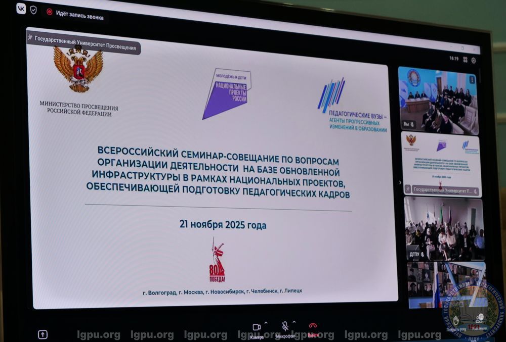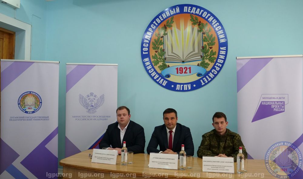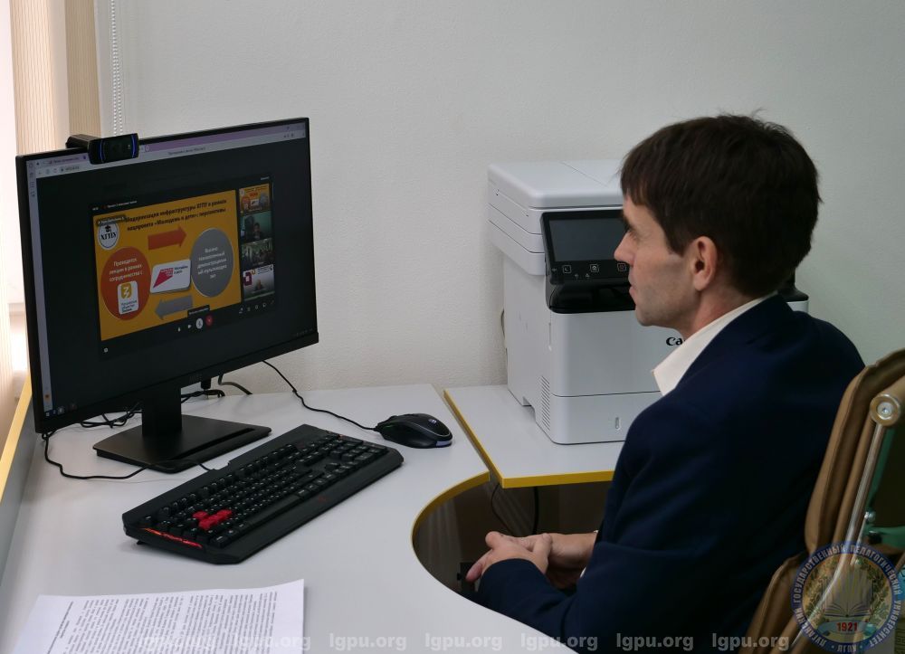 Луганский государственный педагогический университет 21 ноября принял дистанционное участие во Всероссийском семинаре-совещании по вопросам организации деятельности на базе обновленной инфраструктуры в рамках национальных проектов, обеспечивающей подготовку педагогических кадров.В мероприятии приняли участие: проректор по международной и проектной деятельности ЛГПУ Иван Дяченко, директор Центра духовно-нравственного воспитания молодежи вуза Кирилл Зажицкий, руководитель Центра военно-патриотического воспитания молодежи «Редут» имени Б.Е. Бельграя ЛГПУ Дмитрий Лебединец, а также студенты университета.