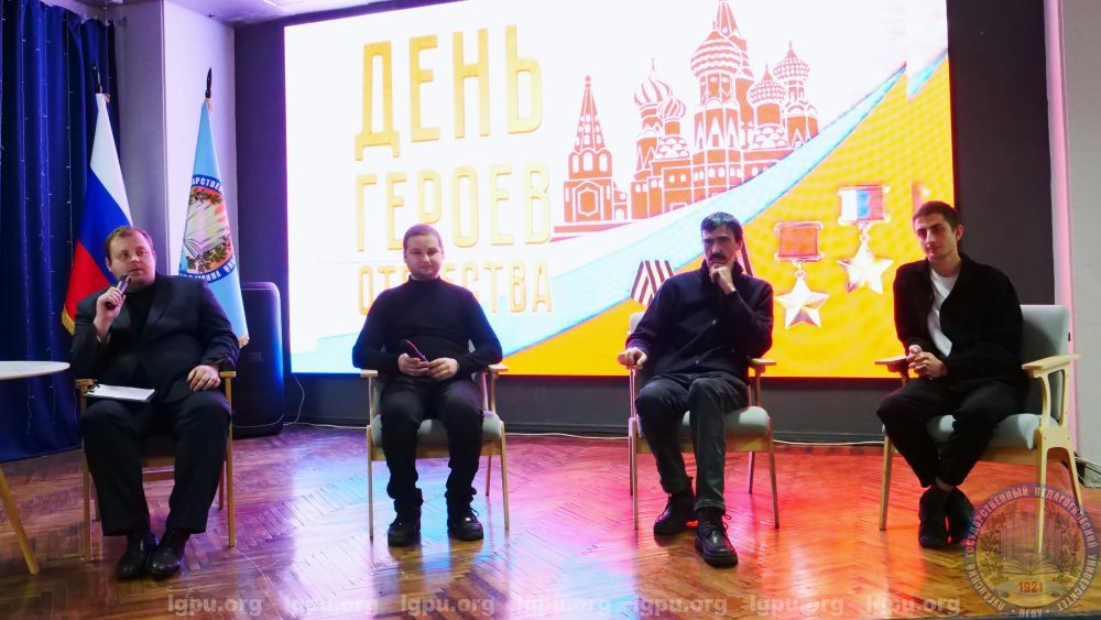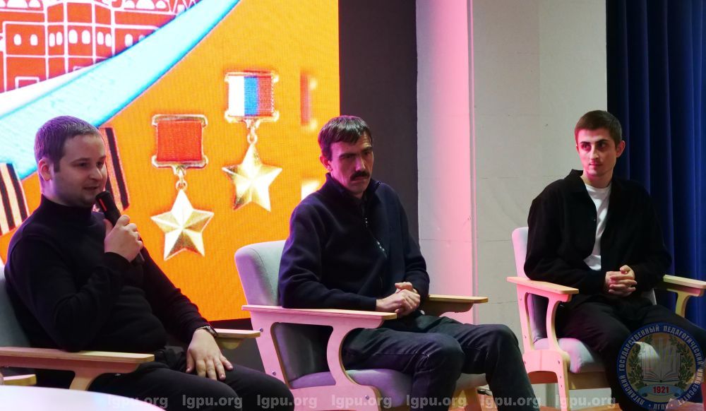 Мероприятие продолжилось в формате «диалога с героями». Студенты встретились с сотрудниками ЛГПУ-участниками Специальной военной операции: старший преподаватель кафедры международных всемирной истории и международных отношений Института истории международных отношений и социально-политических наук Алексей Корниловский, ведущий специалист Центра духовно-нравственного воспитания молодежи Виталий Шевченко, ведущий специалист управления планирования и контроля закупок Олег Колесник. Каждый из них поделился своей историей. Активисты смогли получить ответы на все интересующие вопросы.