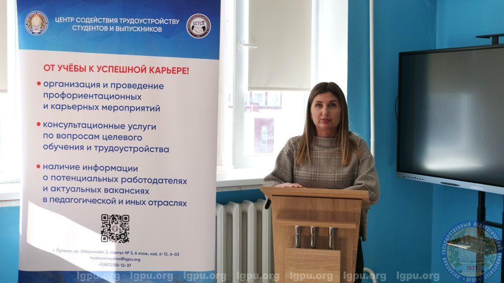 В Луганском государственном педагогическом университете (ЛГПУ) 23 марта состоялся семинар-консультация «Час с профессионалом». Мероприятие, организованное Центром содействия трудоустройству студентов и выпускников, было направлено на помощь в построении карьеры учащимся выпускных курсов.Встреча собрала более 50 студентов Института физического воспитания и спорта. Главными спикерами выступили представители Федеральной службы войск национальной гвардии Российской Федерации по Луганской Народной Республике.