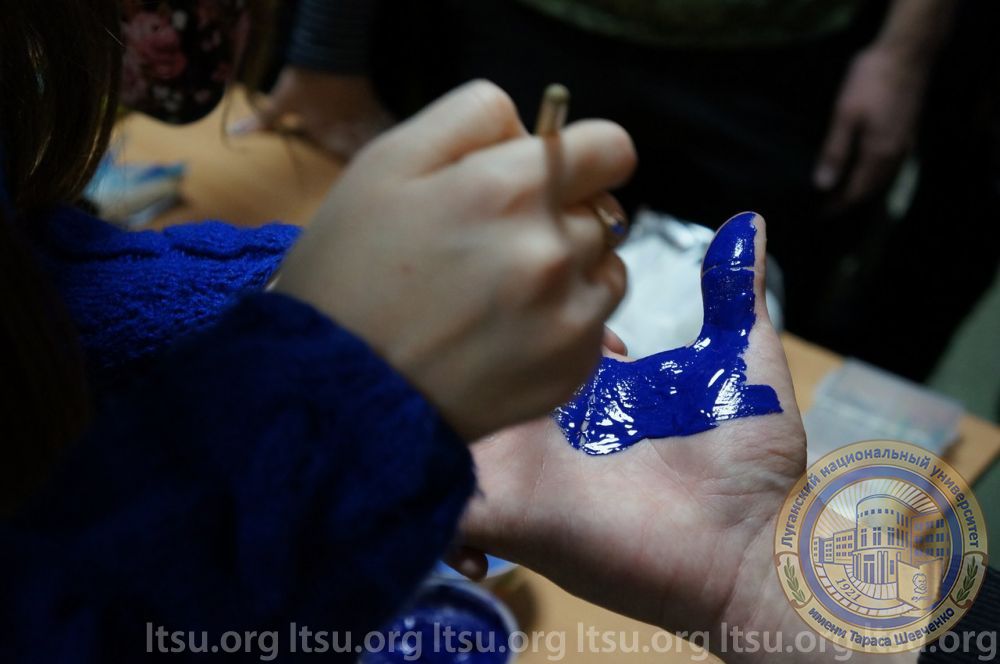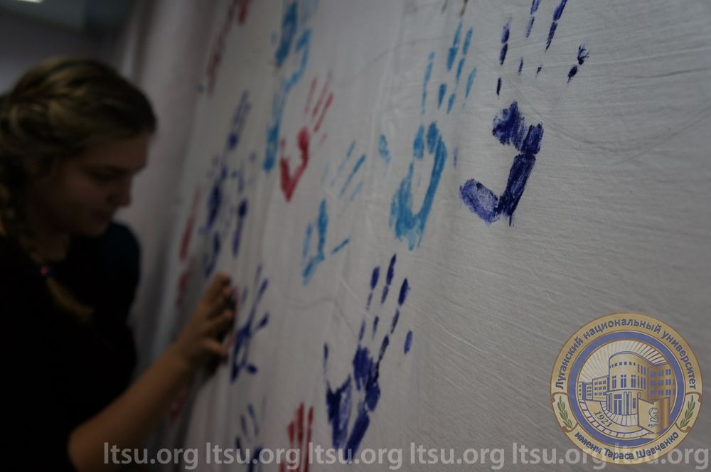 Ректор поздравила всех с праздником и положила начало традиционной акции. Она оставила отпечаток своей ладони на полотне, после чего ее примеру последовали все присутствующие студенты и преподаватели.