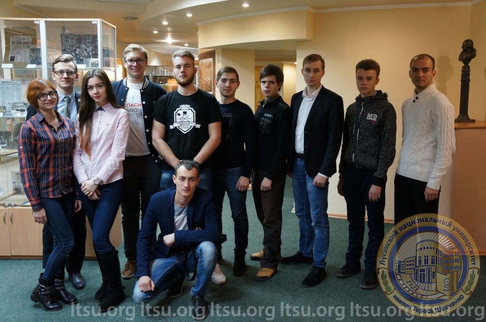 С утра для участников форума были проведены специальные экскурсии по территории ЛНУ имени Тараса Шевченко, благодаря которым гости узнали много интересного об этом учебном заведении. Свои двери для гостей открыл музей Луганского национального университета имени Тараса Шевченко. Стоит отметить, что хоть музей университета относительно молодой (прим. – начал свою работу в 2011 году), но за столь короткий период стал настоящей жемчужиной университета, соединив уникальный выставочный фонд и трепетную заботу его хранителей и составителей. Экспозиция музея формировалась на протяжении нескольких лет разными преподавателями. Основой музея стала коллекция Алексея Михно, доцента кафедры украинской литературы, в течение всей своей деятельности в университете собиравшего документы по истории вуза. Позже был сформирован музейный фонд и создана экспозиция. Участники Молодежного форума «Донбасс» стали свидетелем прошлого ЛНУ имени Тараса Шевченко, и в этом им помогла особая атмосфера и творческий подход сотрудников музея к своему делу. Особенно субботних посетителей заинтересовала книга с автографом известного поэта М. Матусовского, документальное подтверждение обучения которого прослеживается в именном списке избирателей-студентов ІІ курса литературного отделения и копии газеты «Ворошиловградская правда» с материалами фольклорной практики студентов за 1934 год.