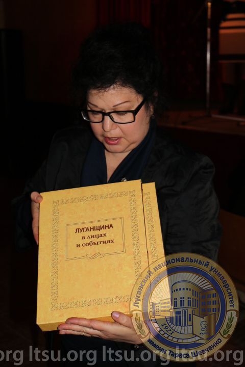 Руководитель Центра инноваций Луганской молодежной библиотеки Ирина Морозюк подарила учебному учреждению книгу по истории нашего края – «Луганщина в лицах и событиях», в которой упоминается и юбиляр.