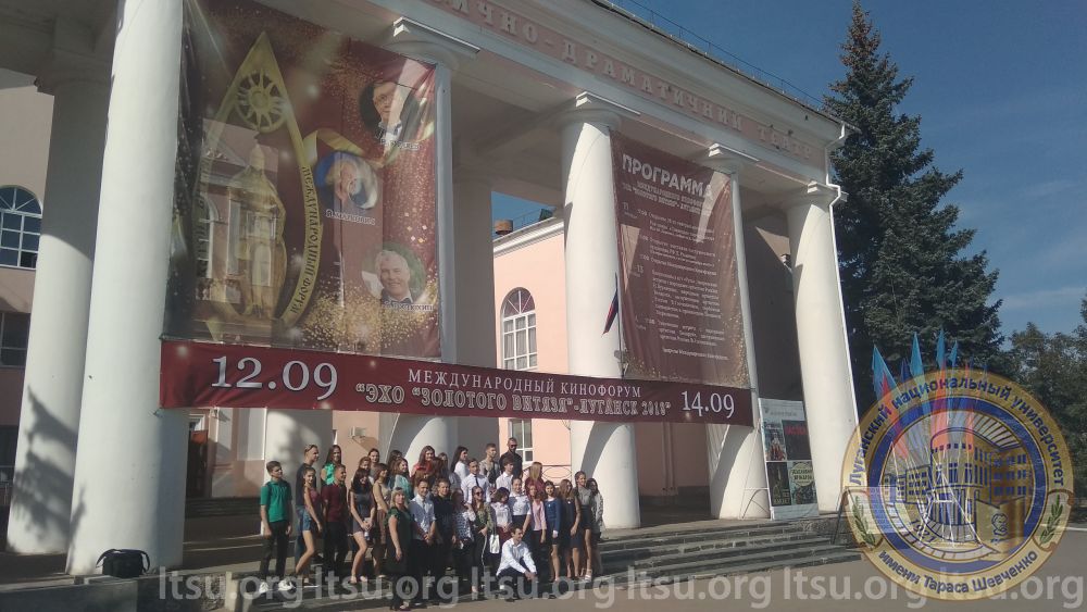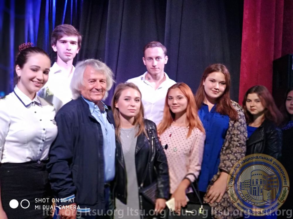 В Луганском академическом музыкально-драматическом театре на Оборонной 14 и 15 сентября состоялась встреча студентов Института культуры и искусств Луганского национального университета имени Тараса Шевченко с народным артистом Беларуси Владимиром Гостюхиным и сербским сценаристом и продюсером Йованом Марковичем.Мероприятие было организовано в рамках Международного кинофорума «Эхо "Золотого Витязя" – Луганск 2018». В ходе встречи гости поделились творческим опытом и дали полезные советы молодым деятелям киноискусства. На встрече присутствовали студенты Института культуры и искусств направления подготовки «Телевидение» и специальности «Режиссура кино и телевидения»: Виктор Полтавец, Карина Джамалян, Анна Андрющенко, Илья Малахов, Александр Фролов, Мария Мирошниченко, Виктория Видющая, Алена Сергиенко и Екатерина Мосьондз.