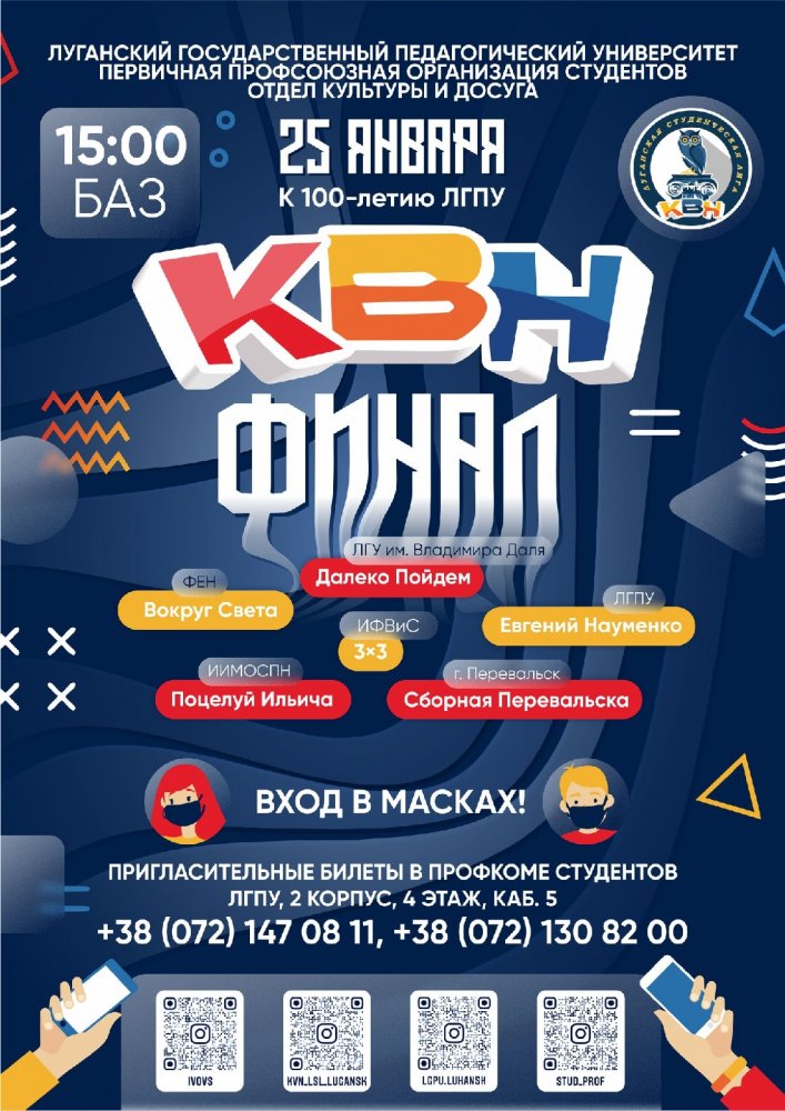 В Луганском государственном педагогическом университете (ЛГПУ) 25 января состоится финал Луганской студенческой лиги (ЛСЛ) КВН сезона 2020 года. В игре примут участие команды структурных подразделений ЛГПУ и другие команды, завоевавшие право побороться за победу в сезоне.Уже скоро будет определена команда, которая поднимет над головой заветный кубок. За золотые медали сразятся: «3х3» (Институт физического воспитания и спорта ЛГПУ), «Поцелуй Ильича» (Институт истории, международных отношений и социально-политических наук ЛГПУ), «Вокруг света» (факультет естественных наук), «Евгений Науменко» (ЛГПУ), «Далеко пойдем» (Луганского государственного университета имени Владимира Даля) и «Сборная Перевальска» (город Перевальск).