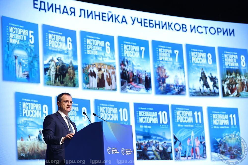 В Казани дан старт третьему Международному форуму министров образования «Формируя будущее», который объединил представителей образовательных систем более 30 иностранных государств. На пленарном заседании выступил помощник Президента Российской Федерации, председатель Российского военно-исторического общества (РВИО) Владимир Мединский. Он рассказал о роли школьного предмета «История» в сохранении национального суверенитета, а также о подготовке новой линейки учебников по этой дисциплине.– Несколько лет назад Президент России поручил Министерству просвещения разработать единую государственную линейку учебников. У нас уже написано 16 томов. Учебники по истории для старших классов появились в школах два года назад, все остальные будут введены с 1 сентября этого года. Кроме того, мы создали специальный раздел на портале «История.рф», который называется «Учителю и ученику». В нем в соответствии с разбивкой по урокам, параграфам выкладывается огромное количество дополнительных материалов. Особо важно, чтобы история не разъединяла наши народы, а объединяла их. Чтобы мы знали и помнили все то хорошее и доброе, что вместе создавали наши предки, чтобы наши страны стали сильнее, а народы жили лучше. Это главная задача школьного курса истории, – сказал он.